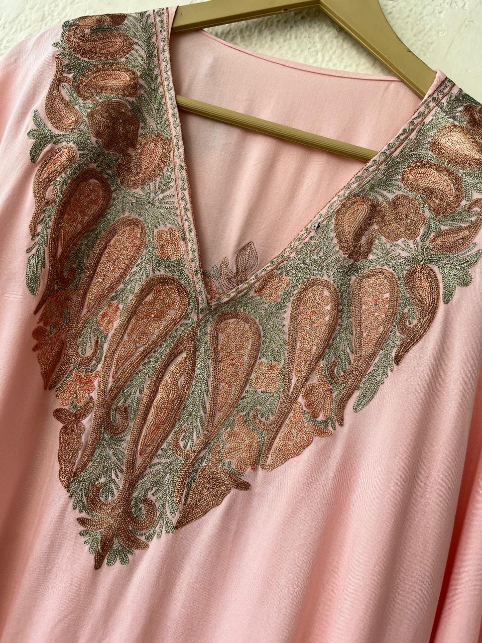 • Authentic Kashmiri Tilla Embroidery: Adorned with delicate, intricate Tilla work, each Kaftan showcases the traditional metallic thread embroidery that is a hallmark of Kashmiri craftsmanship. This fine detailing adds a touch of subtle shimmer and regal charm.