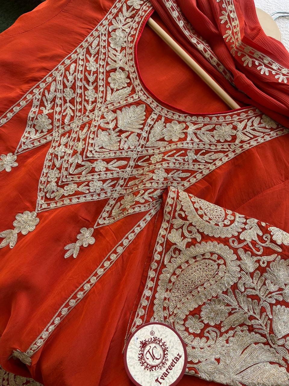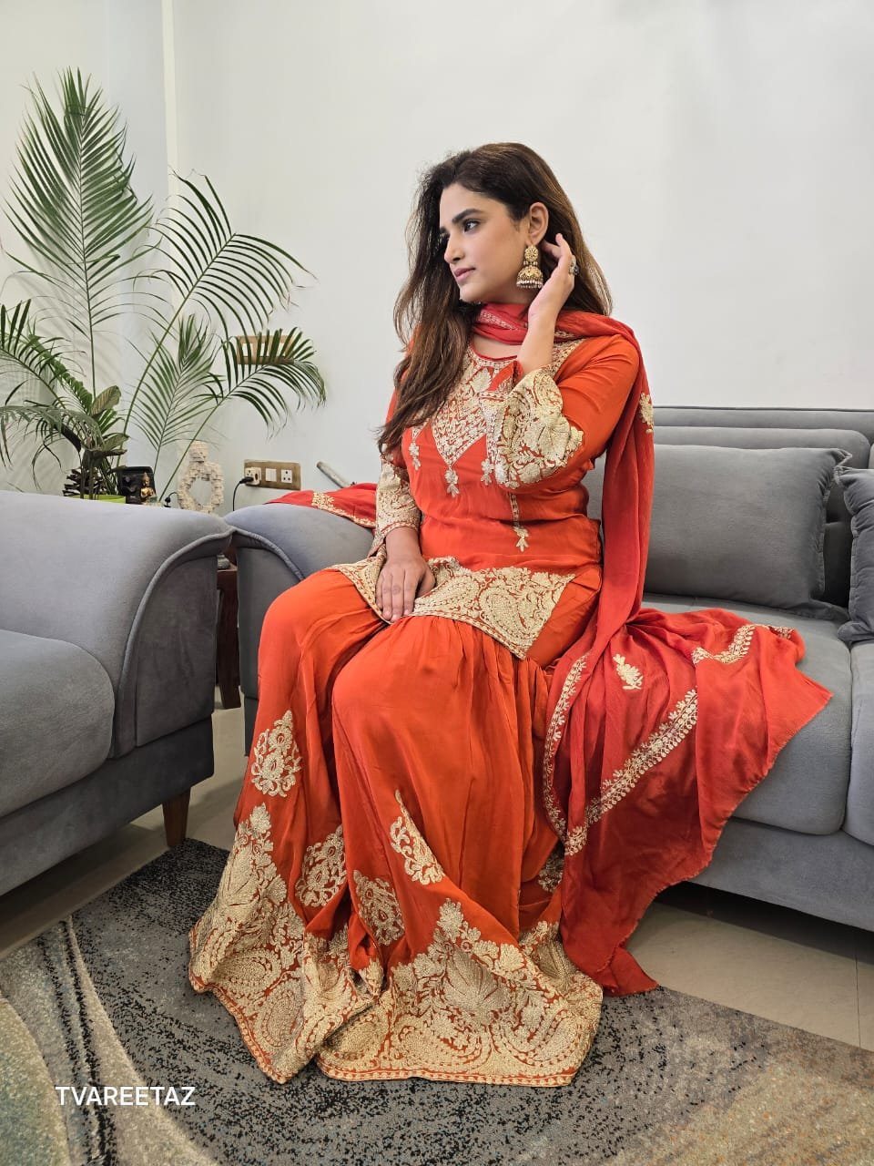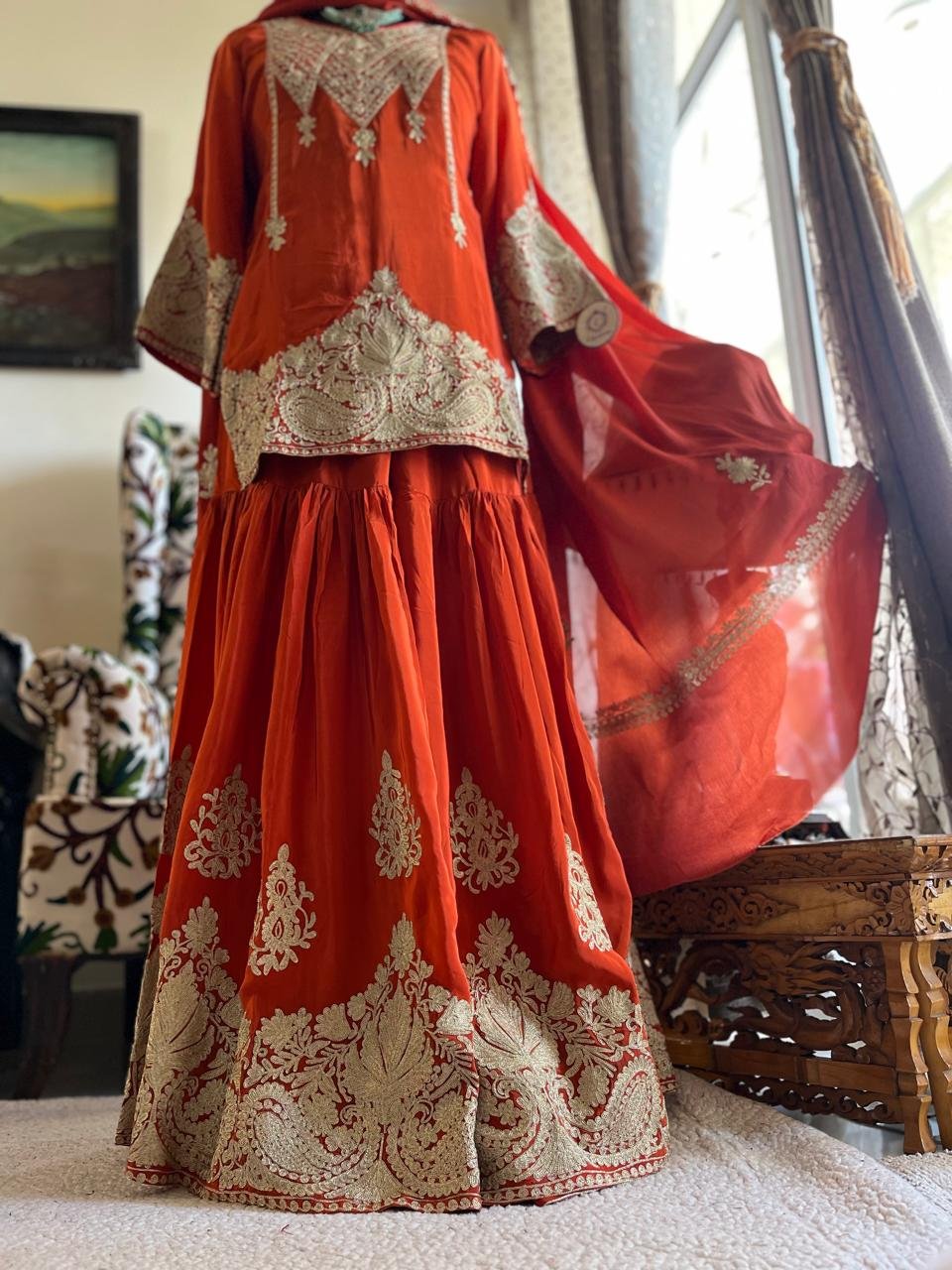 Step into the world of elegance with the Tvareetaz Designer Jaan-nashi Sharara Suit, where heritage meets haute couture. This exquisite ensemble captures the essence of timeless Kashmiri artistry, adorned with intricate Tilla embroidery that exudes regal charm and sophistication.