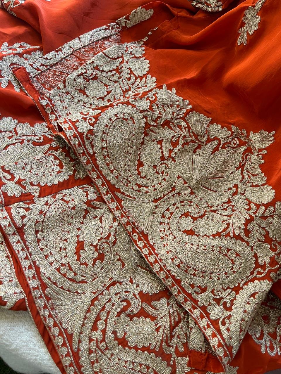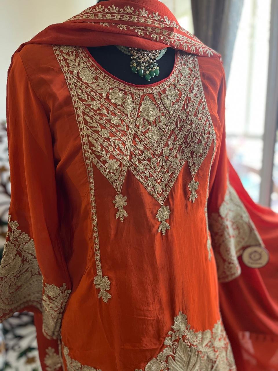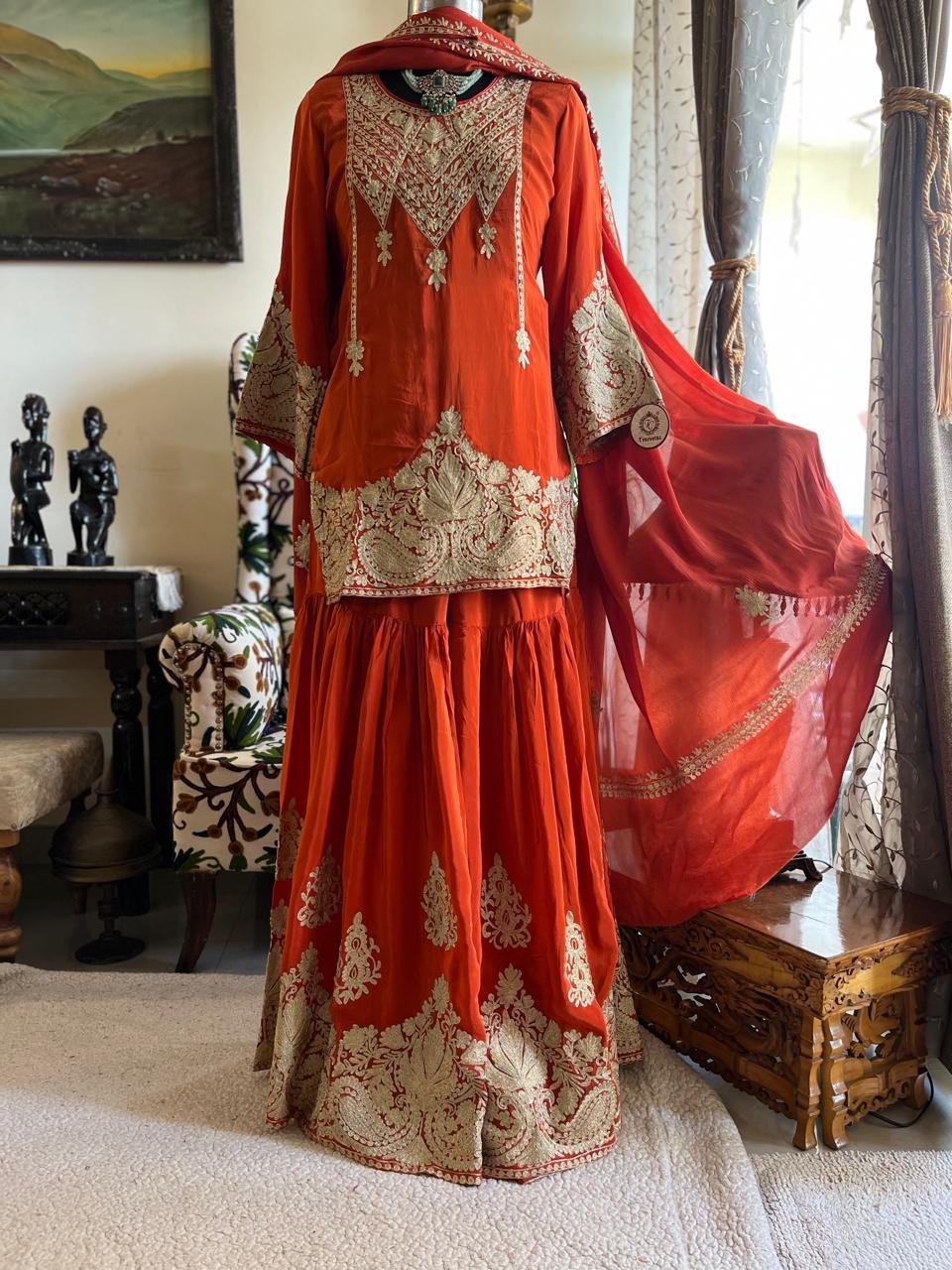 • Embroidery: Handcrafted Kashmiri Tilla Work in antique golden tones