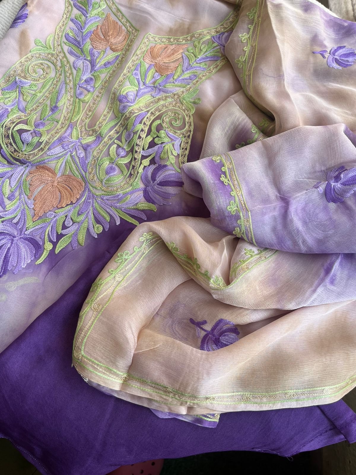 A refined expression of textile artistry, this suit brings together the fluid elegance of georgette with the heritage craft of Kashmiri Aari embroidery. Each piece is individually hand-dyed using the traditional Shibori technique, resulting in subtle variations that make every garment uniquely its own.